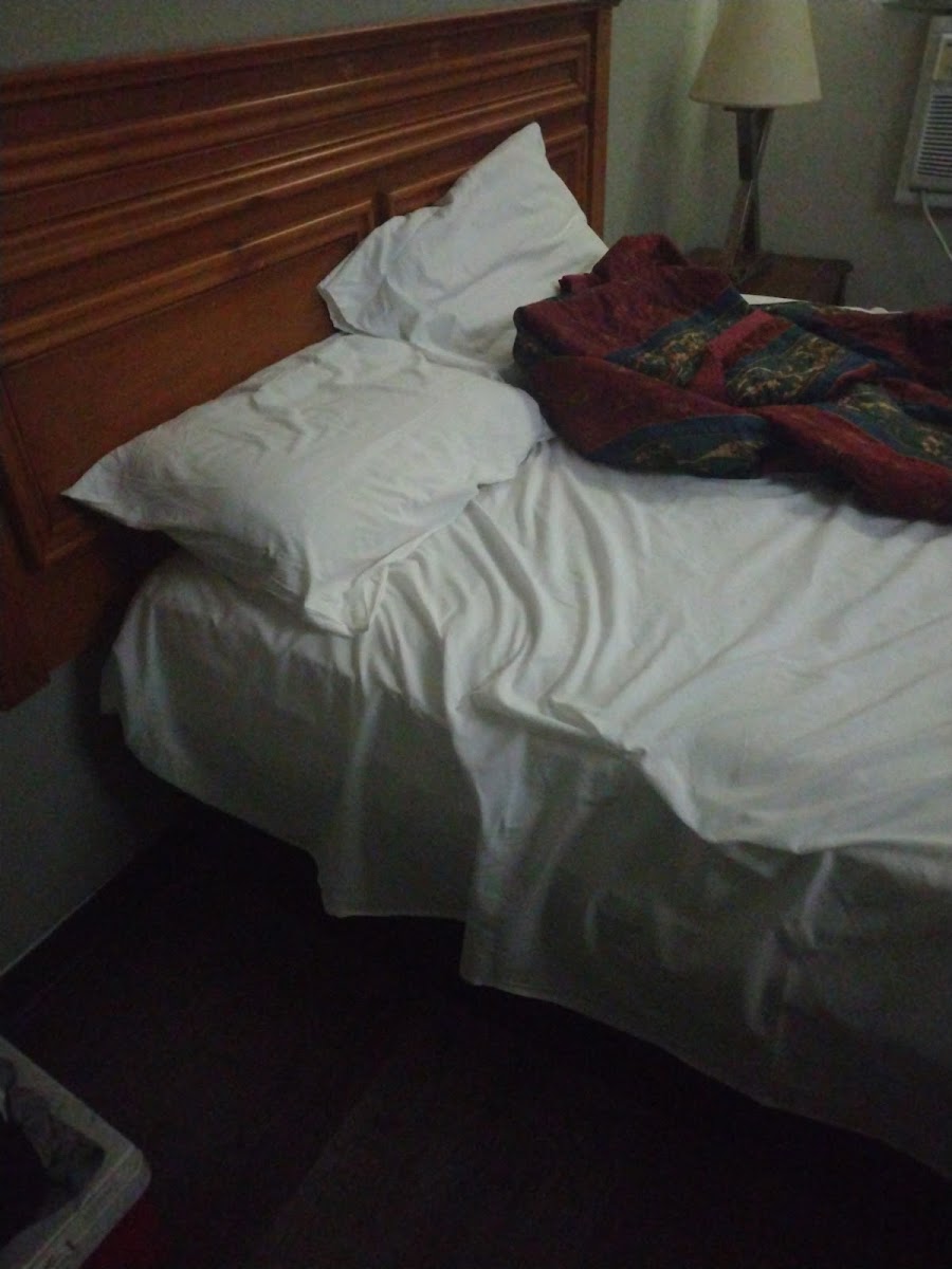 It is a no frills motel , with a bed , a.c and a nice hot water. The bathroom was nice with tile . It was quiet. The people were nice . I wish there were more towels . The floor was sticky . Don't expect a hair dryer , coffee machine. There wasn't an ice machine . There wasn't a vending machine. The bed was comfy. I would stay there again . Half the price of the strip .